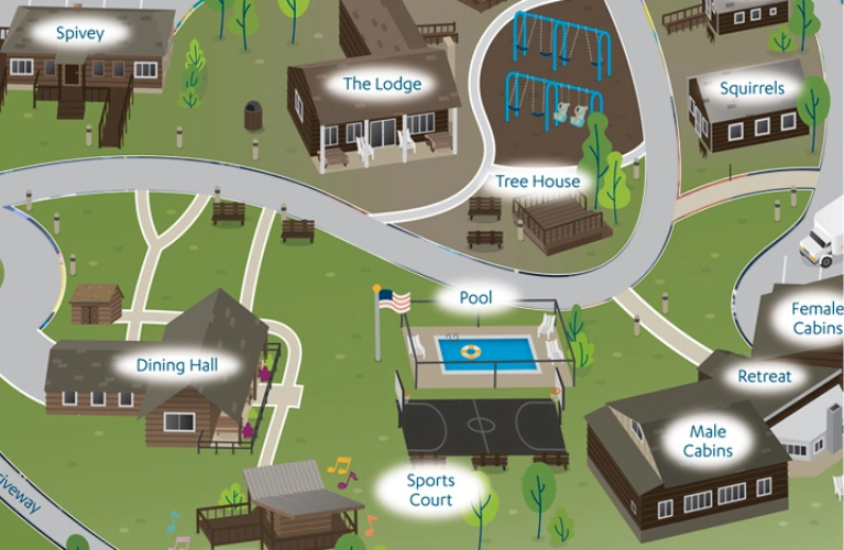 Summer Camp at Camp Baker is filled with places to explore, learn, and have fun. Use the map below to discover the cabins, activity areas, and outdoor spaces that bring camp to life.